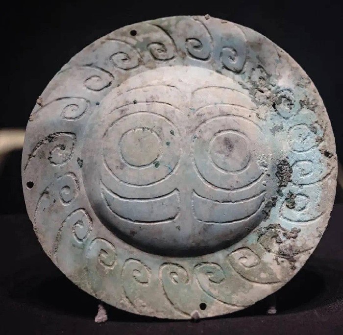青铜圆形牌饰。乍眼一看,青铜圆形牌饰的造型与纹路,好似一只昂首看天的猫头鹰。牌饰东南西北四方各有一孔,或许具备一定功能性,数千年前,它可能正挂在古蜀人的腰间,以做装饰。
