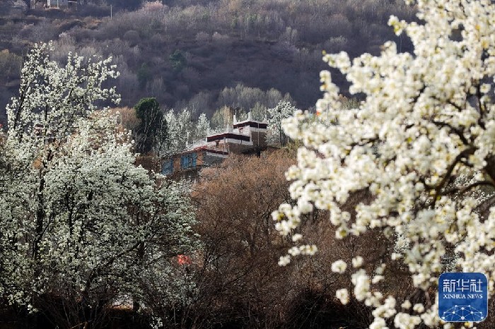 这是3月23日在丹巴县甲居藏寨拍摄的梨花掩映中的藏族民居。新华社记者 沈伯韩 摄