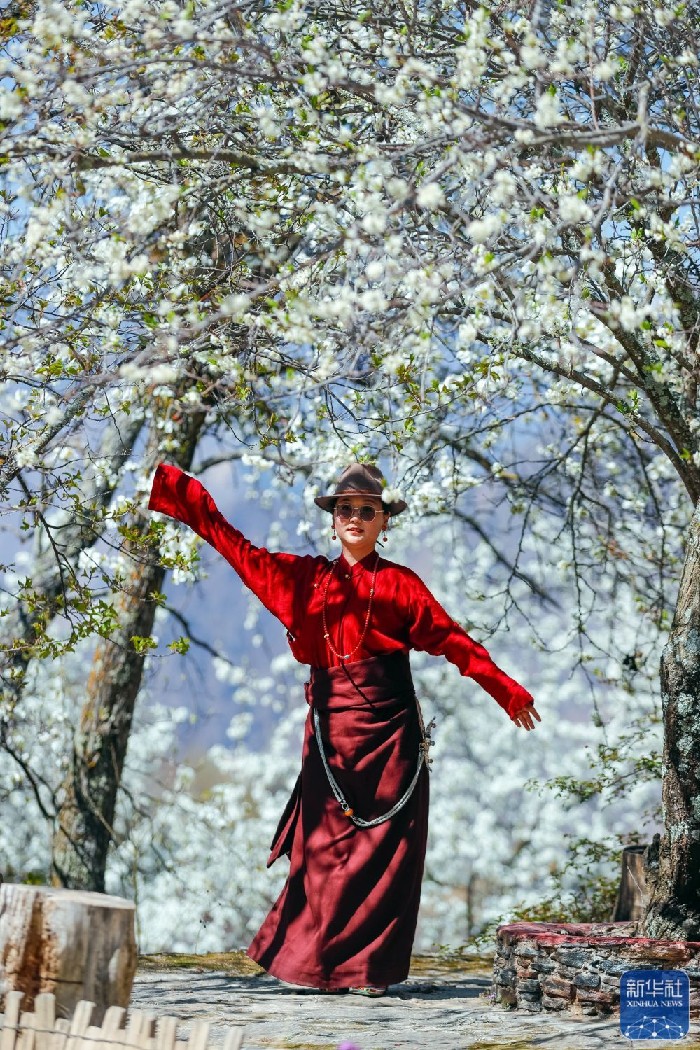 3月23日,在丹巴县中路藏寨的“贰喜·班莫的家”民宿,来自康定的游客在梨花下跳舞。新华社记者 沈伯韩 摄