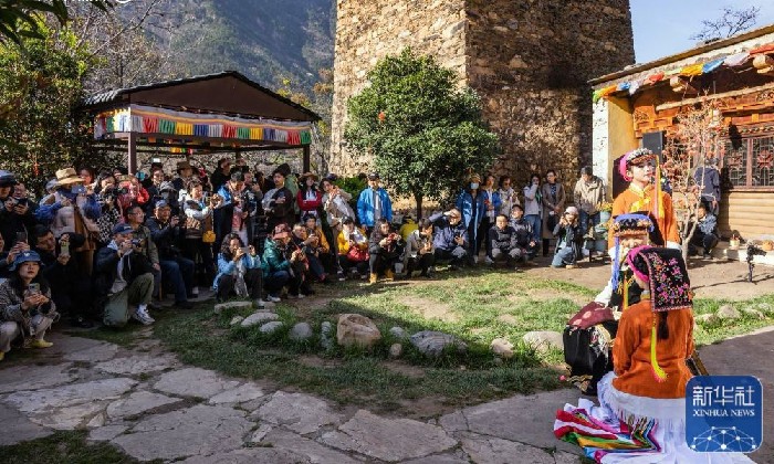 “花开丹巴·为梨而来”2024美人谷·丹巴梨花春赏季活动在丹巴县中路藏寨开启,游人在观赏拍摄嘉绒藏族民俗风情展示(3月21日摄)。 新华社发(何曦摄)