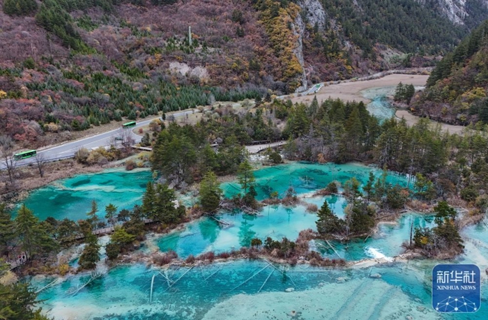11月16日,游客在九寨沟景区双龙海观光(无人机照片)。新华社记者 刘莲芬 摄