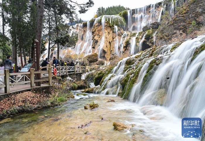 11月16日,游客在九寨沟景区珍珠滩瀑布观光。新华社记者 刘莲芬 摄