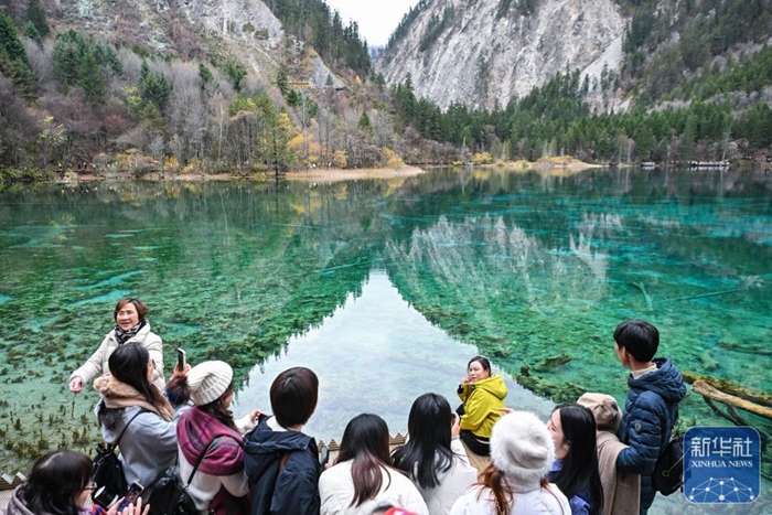 11月16日,游客在九寨沟景区五花海观光。新华社记者 王曦 摄