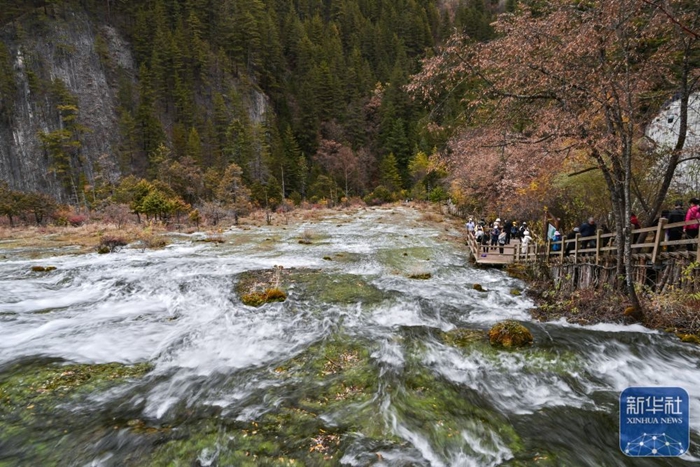 11月16日,游客在九寨沟景区五彩池观光。新华社记者 刘莲芬 摄
