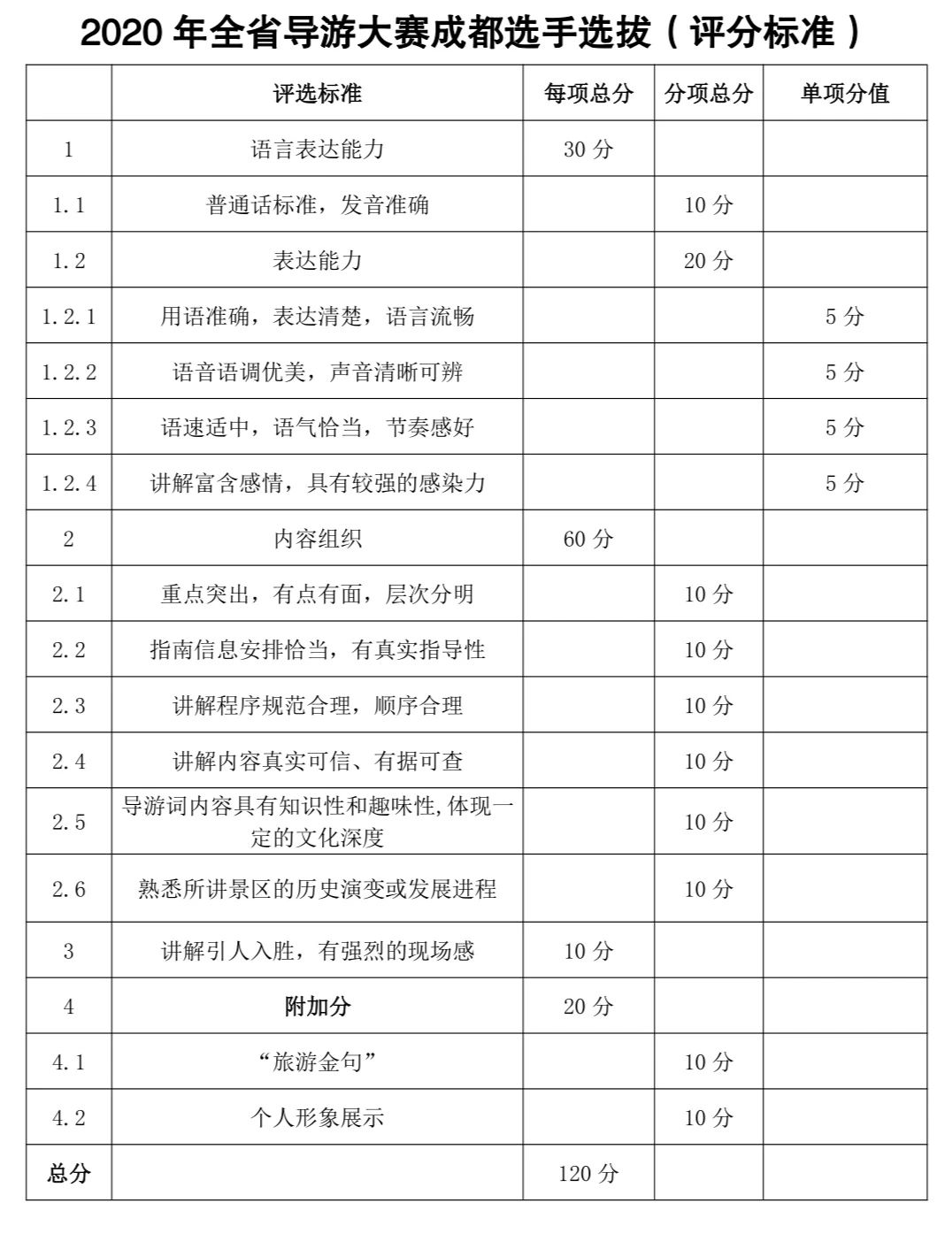 各会员导游: 按照《四川省文化和旅游厅办公室关于开展 2020 年全省导游大赛的通知》(川文旅办发〔2020〕20 号)要求,为进一步提升我市导游(讲解员)队伍形象,传播行业正能量,选拔优秀导游(讲解员)人才,为新冠肺炎疫情后旅游行业恢复发展蓄力储能。结合成都市导游(讲解员)队伍实际选拔出业务综合素质高、引领示范作用强的优秀导游(讲解员)推荐参加全省导游大赛决赛,现将相关事宜通知如下: 一、选拔时间 2020 年 5 月 7 日 二、选拔方式 据成都疫情防控情况,各行业协会选拔赛自行组织开展,按分配名额报送选手,市文广旅局 5 月 7 日组织专家开展选拔评审工作,选拔 17 名选手推荐参加全省导游大赛决赛。 三、评审专家 通过成都旅游产业发展专家库抽选 5 名旅游行业专家参与评审选拔工作。 四、推荐选手要求 (一)持有电子导游证且从事导游服务1年以上的导游,或持有景区和文博单位讲解员证且从事讲解服务1年以上的专业讲解员。 (二)参赛前3年内未受到文化和旅游部行政部门行政处罚。 (三)工作期间表现良好,游客评价优良,无重大投诉。 (四)2019年成都百万职工技能大赛导游服务技能竞赛前10名选手由工作单位直接推荐。 (五)各行业协会按名额分配优先推荐2019年成都百万职工技能大赛导游服务技能竞赛11-20名选手。 (六)景区、文博单位讲解员由成都旅游景区协会统一推荐。 五、推荐选手名额分配 协会选送8名选手代表参赛。 六、参赛要求 (一)推荐选手需录制 1 个“家乡美”主题视频短片。内容应包括自我介绍,语言简练,突出特色,有强烈的感染力。(时长 1 分钟,视频格式 1920×1080 像素以上,比例16:9)。 (二)推荐选手需录制 1 个导游讲解短视频,讲解范围四川省 A 级旅游景区、红色旅游、历史文化、民族文化、都市观光、乡村旅游、工农业旅游等旅游项目。要求重点突出,讲解完整。鼓励 选手创作并使用“旅游金句"即用最精练、最经典、最具创意的语言概括对景区的介绍或历史传说、古文化遗存、旅途感悟等内容。同时,讲解内容须包含部分游览消费信息及文明旅游引导,如旅游城市(乡镇)、旅游区(点)周边的餐饮、住宿、娱乐指南等,内容不必面面俱到,选择一点或几点即可,但必须真实具有指导性。(时长 5 分钟,视频格式 MP4、WMV)。 (三)报名会员,请于4月30日 12:00 前将以下资料报送
