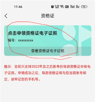 (二)下载“全国导游之家”APP,安装登录,点右下角“我的”—“电子证照”—“导游证资格”—“申领资格证电子证照”,可查询到导游资格证书编号为DZG2024SCXXXXX。