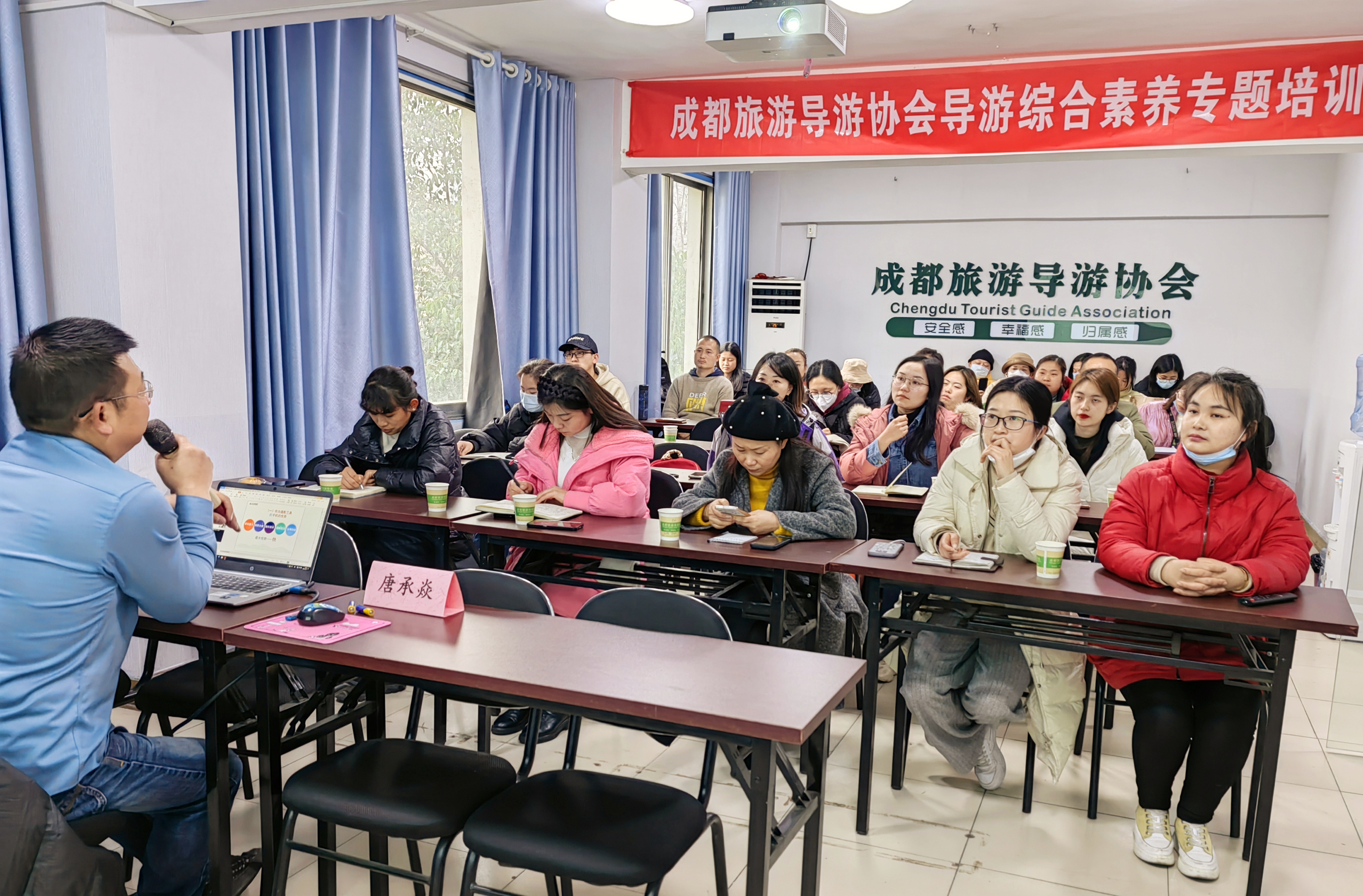 培训会上,唐老师围绕后疫情时代导游行业的状况以及导游应该具备的能力素养进行了分享。此外还分享四川旅游地理知识、中国民歌、手机摄影、风光摄影等相关知识。尤其手机摄影,在当前带团非常实用,学员们认真听讲,踊跃参与实践操作,积极参与,学习热情高涨。